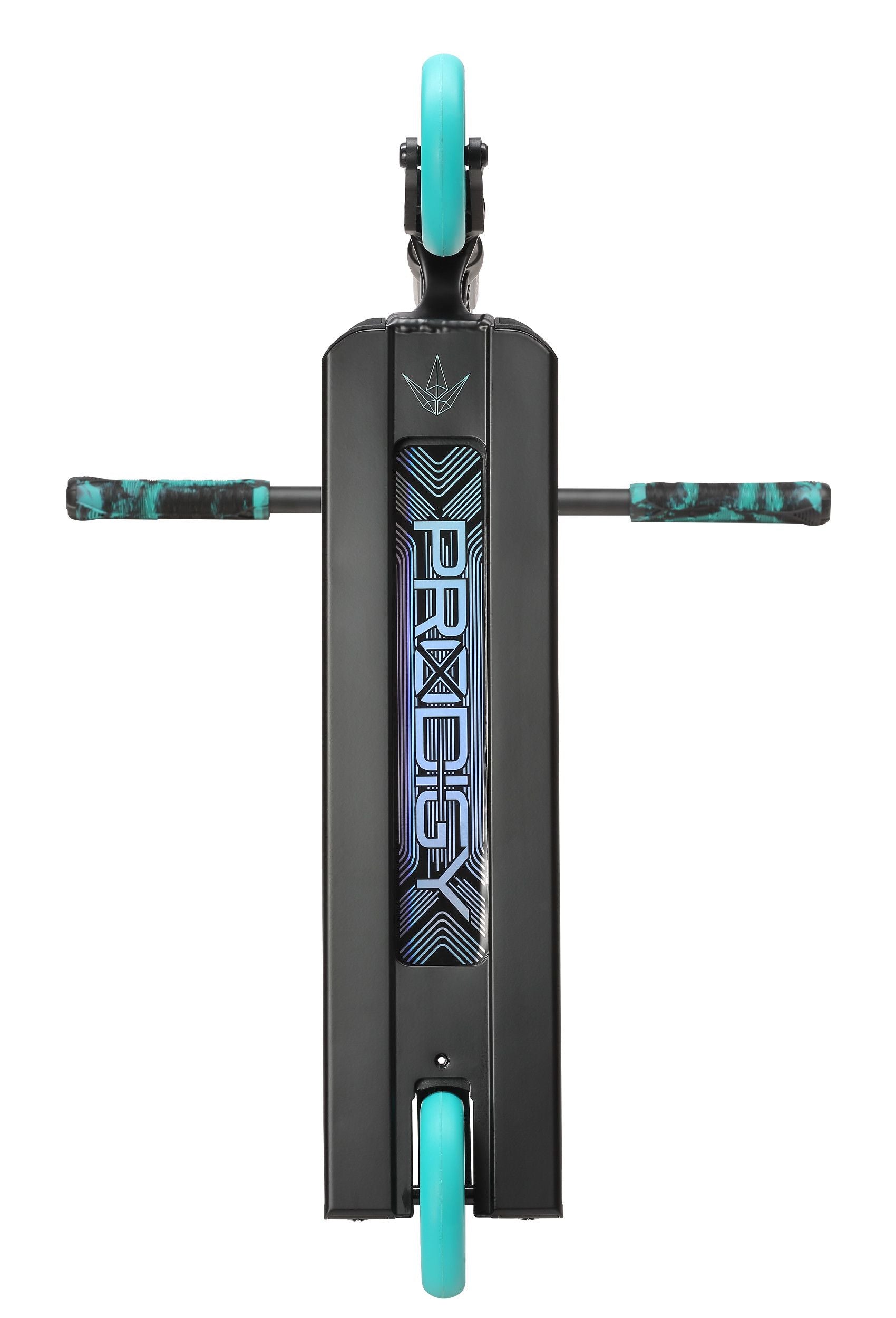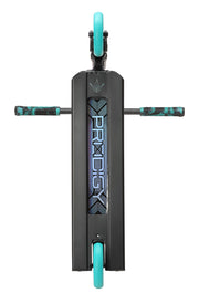 El resto del patinete ha sido revisado con algunas mejoras importantes. Para la serie X, se ha desarrollado un nuevo proceso de fabricación en el deck, la extrusión Extech. Esta extrusión tiene un perfil más bajo, paredes internas más anchas, con un cóncavo muy activo. El tubo de dirección Prodigy X también ha sido rediseñado, aumentando el contacto con el deck, con un corte de diamante y un perfil aerodinámico. La base Prodigy X es ahora más ancha que los modelos anteriores, 5,5" de ancho x 21" de largo con su nuevo extremo de caja de aluminio.